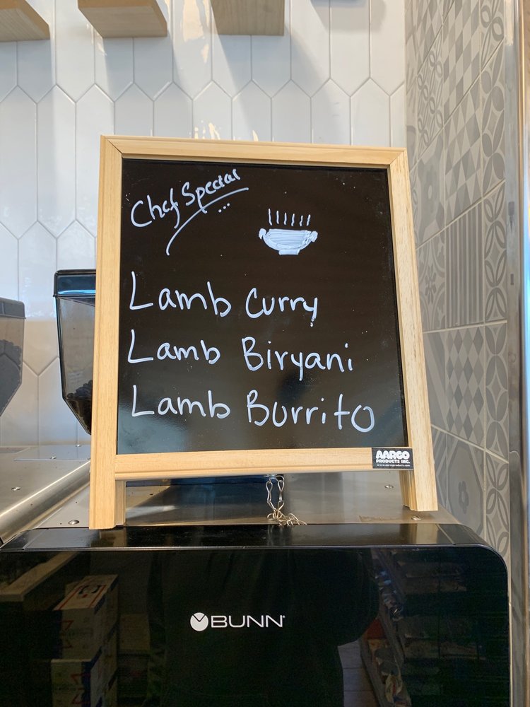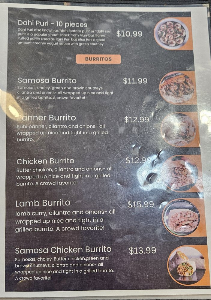 Samosas, choley, green and brown chutneys, cilantro and onions all wrapped up nice and tight in a grilled burrito. A crowd favorite!