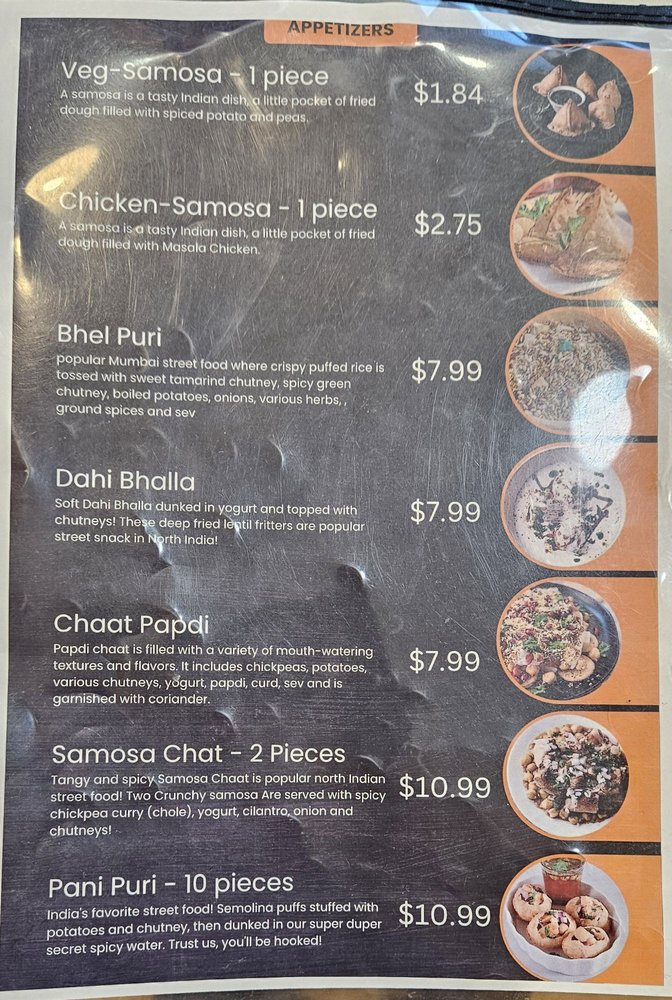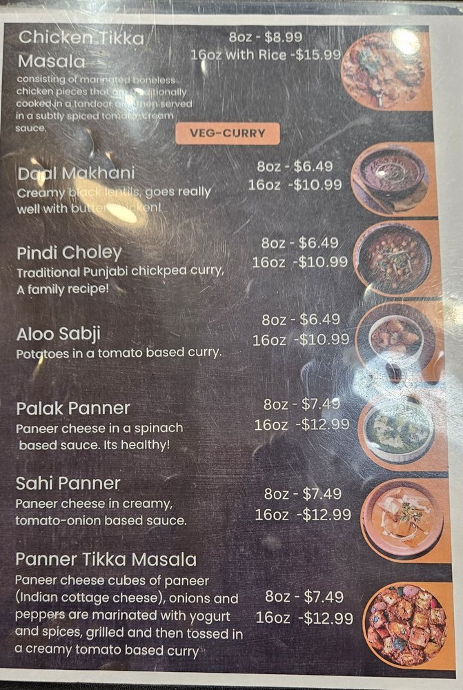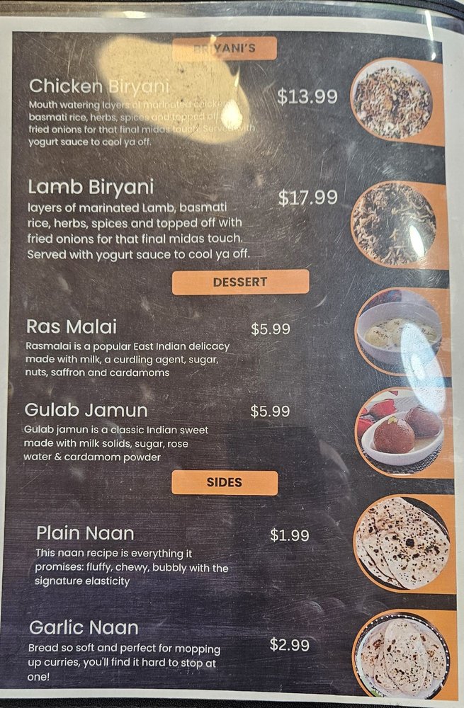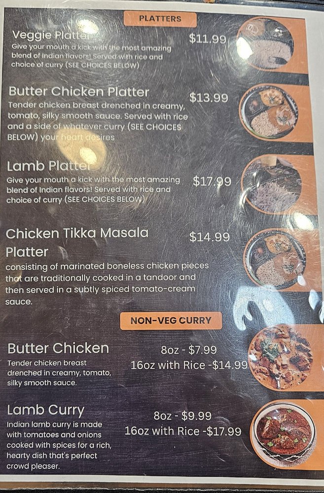 - For heartier meals, indulge in the Butter Chicken Platter or the royal Chicken Biryani, layered with marinated chicken and aromatic basmati rice.